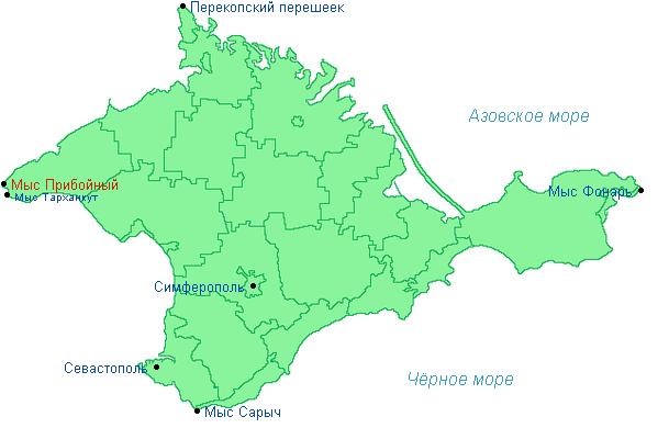 • Мыс Сарыч Симферополь • Севастополь • • Перекопский перешеек Мыс Фонарь • • Мыс Прибойный • Мыс Тарханкут Чёрное море Азовское море